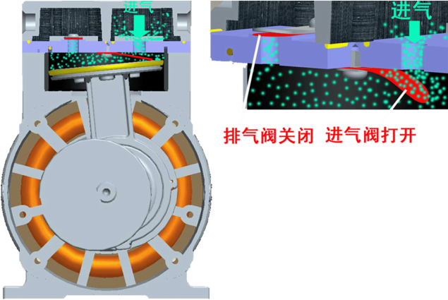 定子進(jìn)排出口分離開來(lái),周而復(fù)始運(yùn)轉(zhuǎn),進(jìn)行變?nèi)荩瑢⑽霘怏w,從排氣口排出,從而達(dá)到抽氣目的。