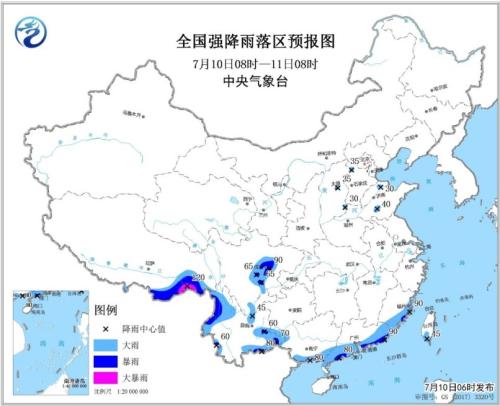 7月10日,據中央氣象臺網站消息,四川盆地西部、福建、廣東等地仍有較強降雨。預計,7月10日08時至11日08時,福建東南部、廣東東部和南部、廣西沿海、云南東南部和西部、四川盆地西部、西藏東南部等地有大到暴雨,其中,西藏東南部局地有大暴雨(100~120毫米),上述部分地區伴有短時強降水(最大小時降水量20~50毫米,局地可達60毫米以上)、局地有雷暴大風等強對流天氣。中央氣象臺7月10日6時發布暴雨藍色預警。
